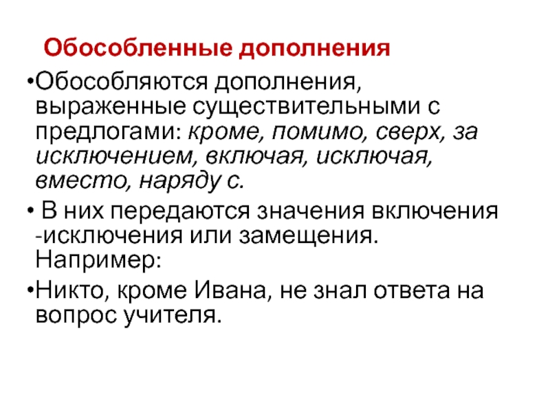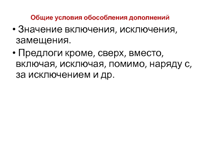 кроме, помимо, сверх, за исключением, включая, исключая, вместо, наряду с.
