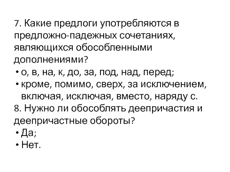 Слайд 357. Какие предлоги употребляются в предложно-падежных сочетаниях, являющихся обособленными дополнениями?