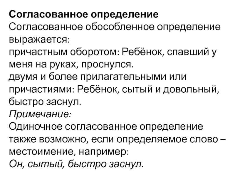 двумя и более прилагательными или причастиями: Ребёнок, сытый и довольный, быстро заснул.