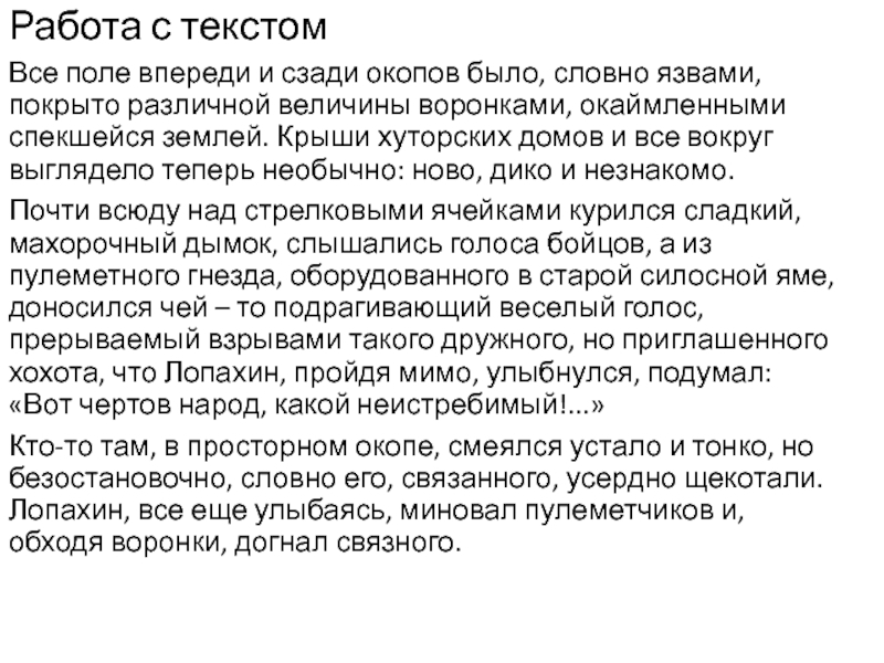 Почти всюду над стрелковыми ячейками курился сладкий, махорочный дымок, слышались голоса бойцов, а из пулеметного гнезда, оборудованного в старой силосной яме, доносился чей – то подрагивающий веселый голос, прерываемый взрывами такого дружного, но приглашенного хохота, что Лопахин, пройдя мимо, улыбнулся, подумал: «Вот чертов народ, какой неистребимый!...»
