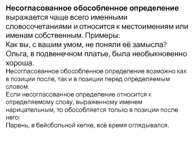Слайд 7Несогласованное обособленное определение выражается чаще всего именными словосочетаниями и относится к