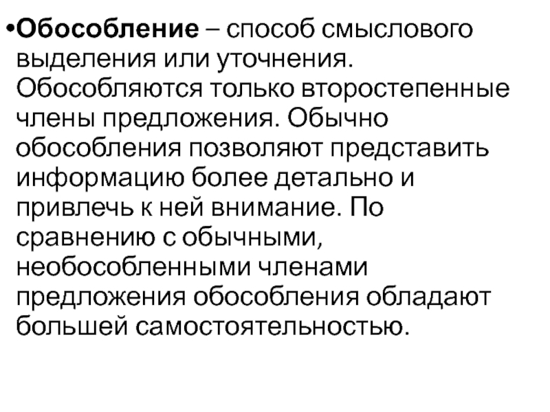 Слайд 3Обособление – способ смыслового выделения или уточнения. Обособляются только второстепенные члены предложения.