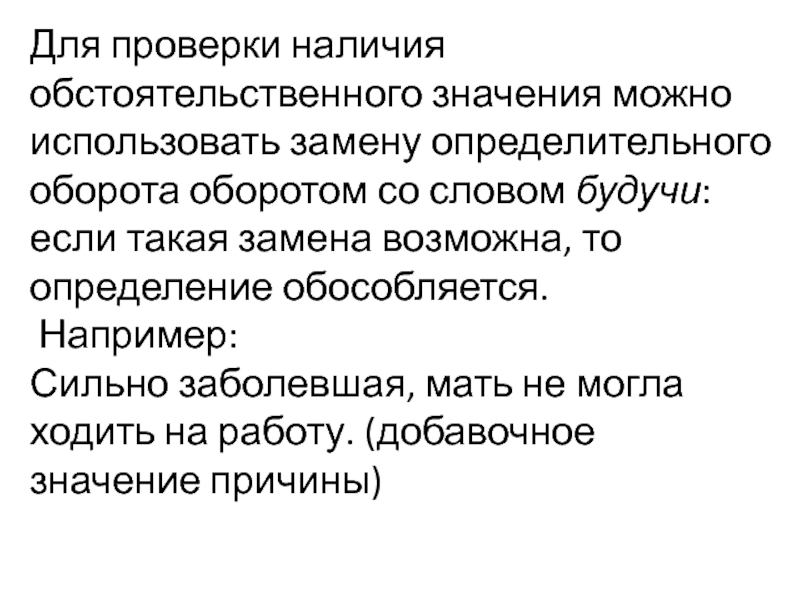 Слайд 14Для проверки наличия обстоятельственного значения можно использовать замену определительного оборота оборотом