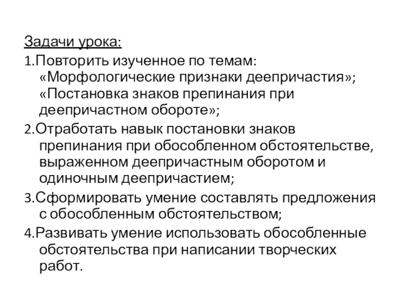 2.Отработать навык постановки знаков препинания при обособленном обстоятельстве, выраженном деепричастным оборотом и одиночным деепричастием;
