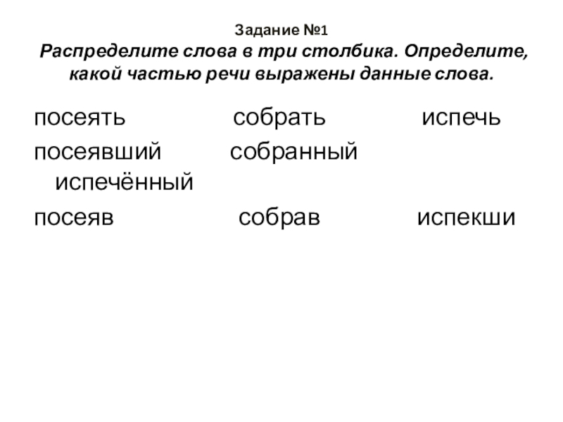 Распределите слова в три столбика. Определите, какой частью речи