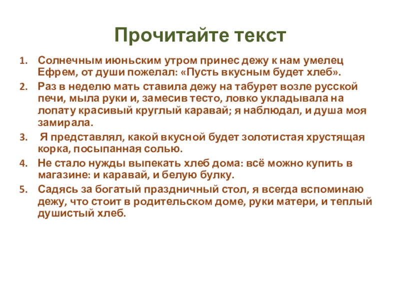 4. Раз в неделю мать ставила дежу на табурет возле русской печи (1 ) мыла руки и (2) замесив тесто (3) сноровисто укладывала на лопату красивый круглый каравай (4) я наблюдал (5)и душа моя замирала.