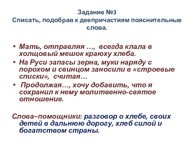 Слова–помощники: разговор о хлебе, своих детей в дальнюю дорогу, хлеб силой и богатством страны.