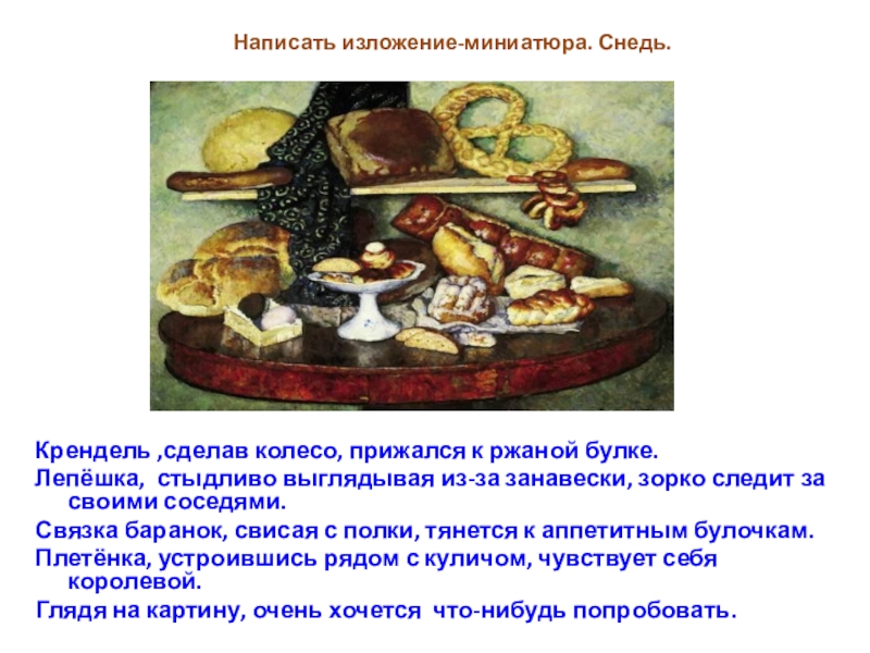 Слайд 19Написать изложение-миниатюра. Снедь.