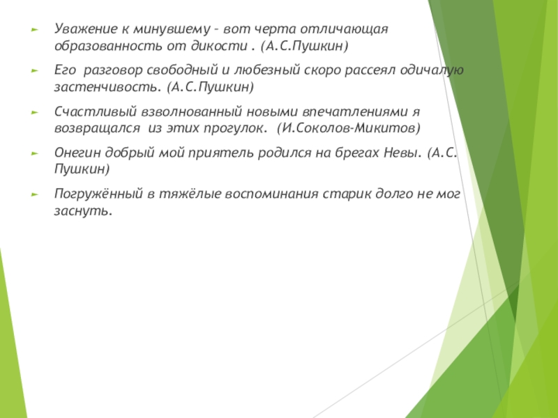 Уважение к минувшему – вот черта отличающая образованность от дикости . (А.С.Пушкин)Его разговор свободный и любезный