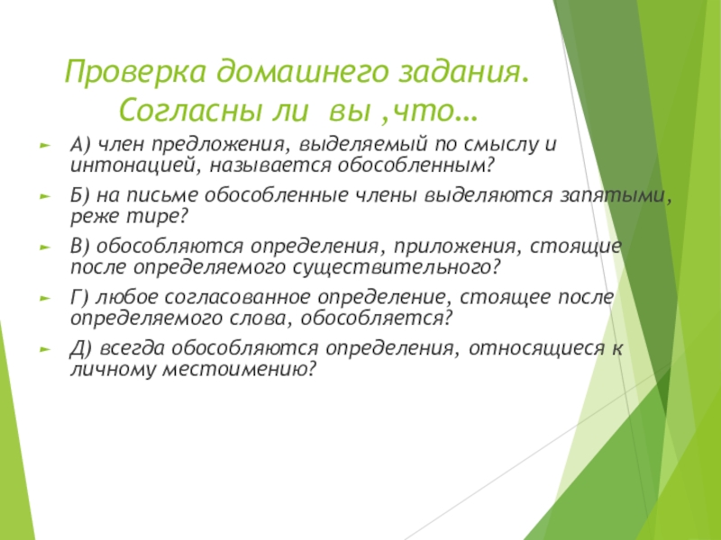 Проверка домашнего задания. Согласны ли вы ,что…   А) член предложения, выделяемый по смыслу и интонацией,
