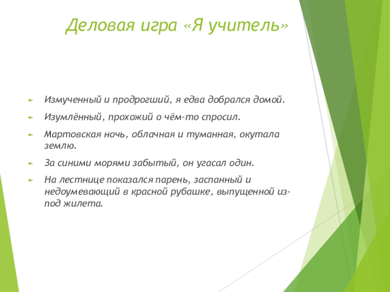 Деловая игра «Я учитель» Измученный и продрогший, я едва добрался домой.Изумлённый, прохожий о чём-то спросил. Мартовская ночь,