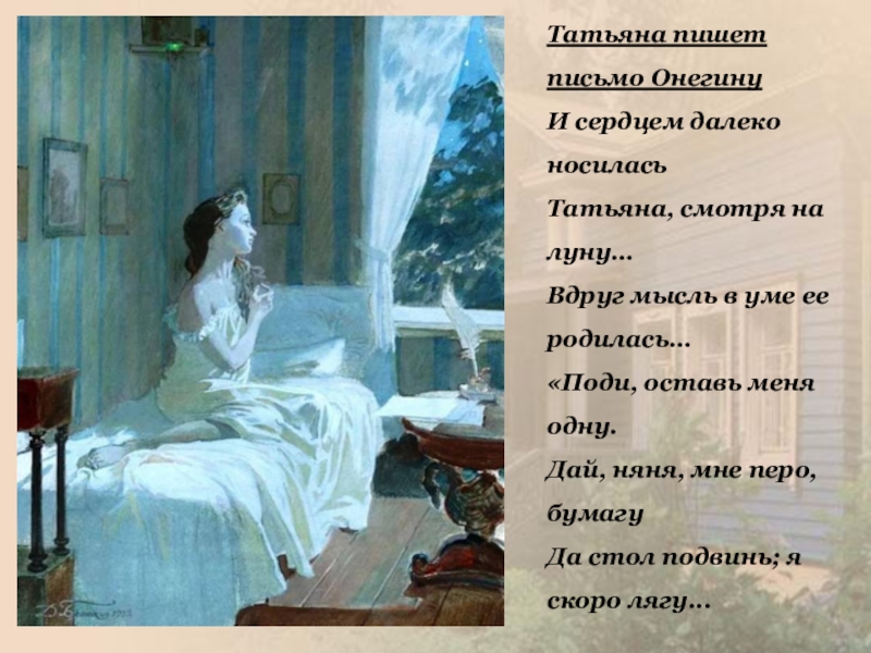 В живописи образ, близкий к Татьяне, создал Кипренский в портрете-картине «Мечтательница».