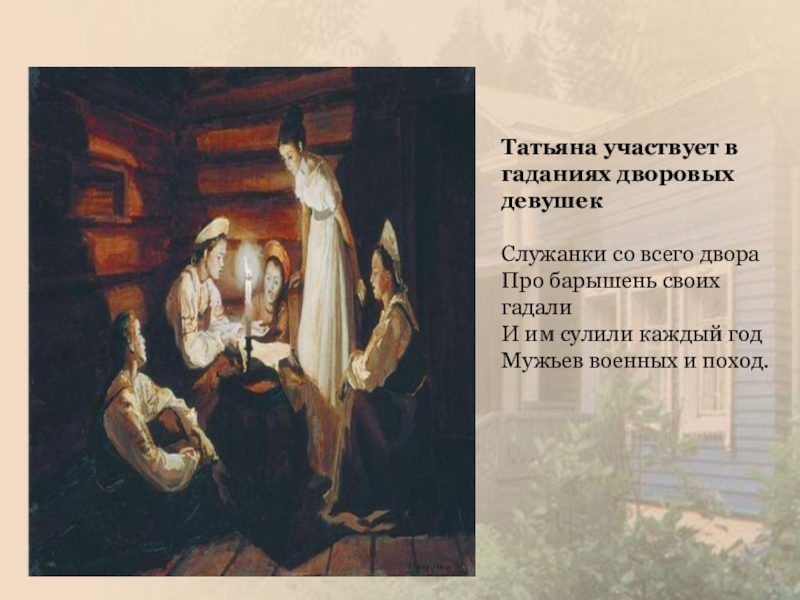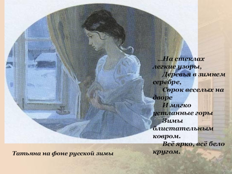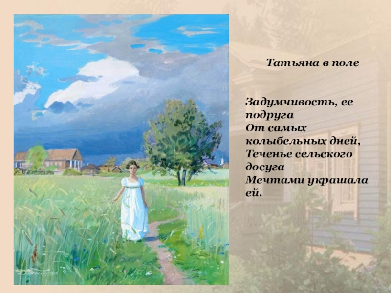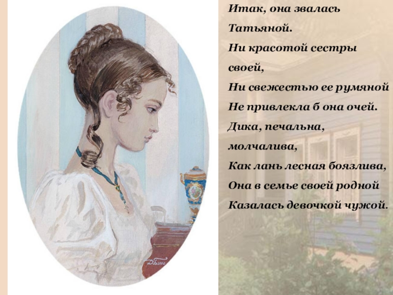 Сравнивая Татьяну с «Мечтательницей», мы ориентируемся только на первые главы романа. Представить себе «Мечтательницу» в виде блестящей светской дамы так же невозможно, как представить себе в этой роли деревенскую Таню.