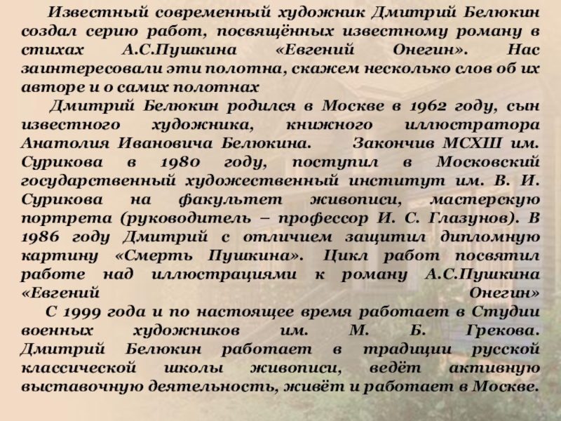 Слайд 10 Известный современный художник Дмитрий Белюкин создал серию работ, посвящённых