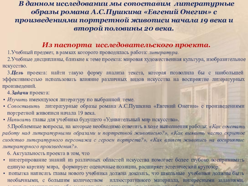 5.Проблемные вопросы, на которые необходимо ответить в ходе выполнения работы: «Как сочетать работу над литературными образами и портретной живописью?», «Как выявить часто скрытое сходство литературного персонажа с героем портрета?», «Как влияет живопись на восприятие литературного произведения?».
