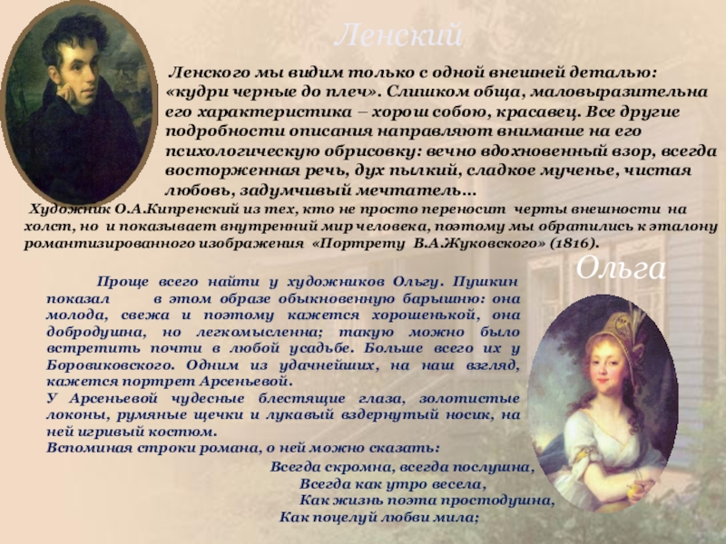 Ленского мы видим только с одной внешней деталью: «кудри черные до плеч». Слишком обща, маловыразительна его характеристика – хорош собою, красавец. Все другие подробности описания направляют внимание на его психологическую обрисовку: вечно вдохновенный взор, всегда восторженная речь, дух пылкий, сладкое мученье, чистая любовь, задумчивый мечтатель…