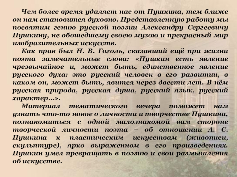 Материал тематического вечера поможет нам узнать что-то новое о личности и творчестве Пушкина, познакомиться с одной малознакомой вам стороне творческой личности поэта – об отношении А. С. Пушкина к пластическим искусствам (живописи, скульптуре), ярко выраженном в его произведениях. Пушкин умел превращать в поэзию и свои размышления об искусстве.