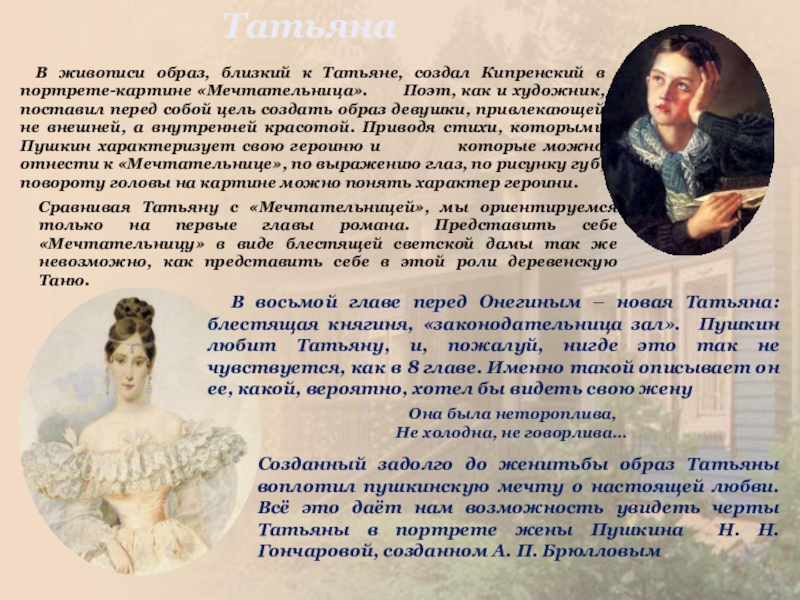 Созданный задолго до женитьбы образ Татьяны воплотил пушкинскую мечту о настоящей любви. Всё это даёт нам возможность увидеть черты Татьяны в портрете жены Пушкина Н. Н. Гончаровой, созданном А. П. Брюлловым