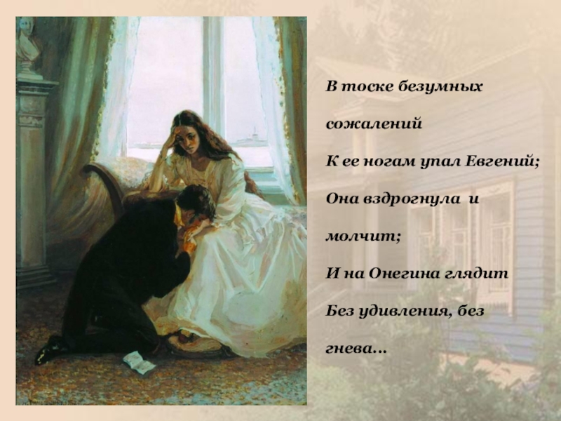В восьмой главе перед Онегиным – новая Татьяна: блестящая княгиня, «законодательница зал». Пушкин любит Татьяну, и, пожалуй, нигде это так не чувствуется, как в 8 главе. Именно такой описывает он ее, какой, вероятно, хотел бы видеть свою жену