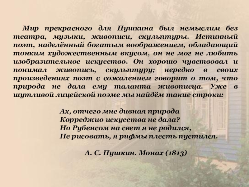 Мир прекрасного для Пушкина был немыслим без театра, музыки, живописи, скульптуры.