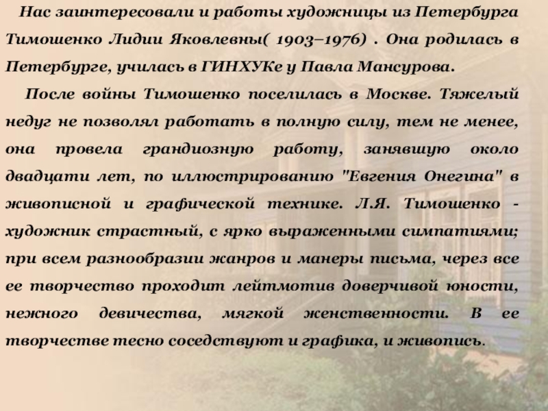 Слайд 15 Нас заинтересовали и работы художницы из Петербурга Тимошенко Лидии