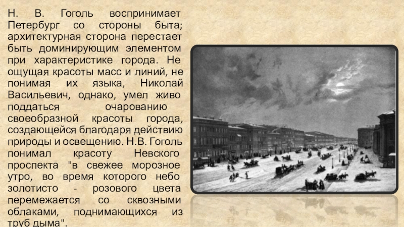Слайд 9Н. В. Гоголь воспринимает Петербург со стороны быта; архитектурная сторона перестает