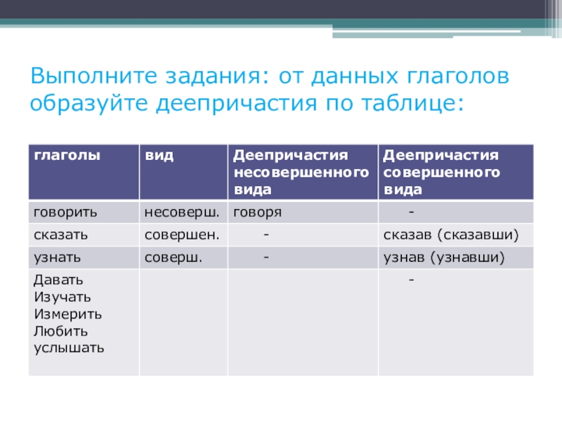 Слайд 6Выполните задания: от данных глаголов образуйте деепричастия по таблице: