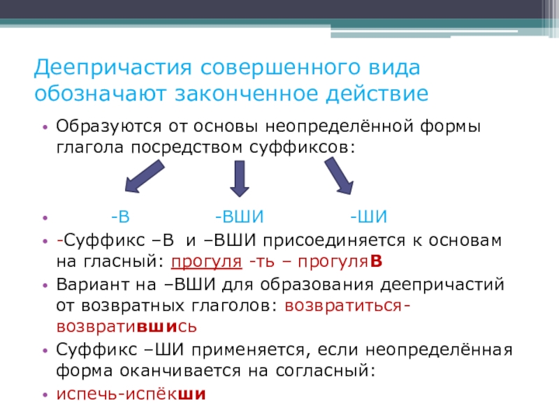 Деепричастия совершенного вида обозначают законченное действиеОбразуются от основы неопределённой формы глагола посредством суффиксов: