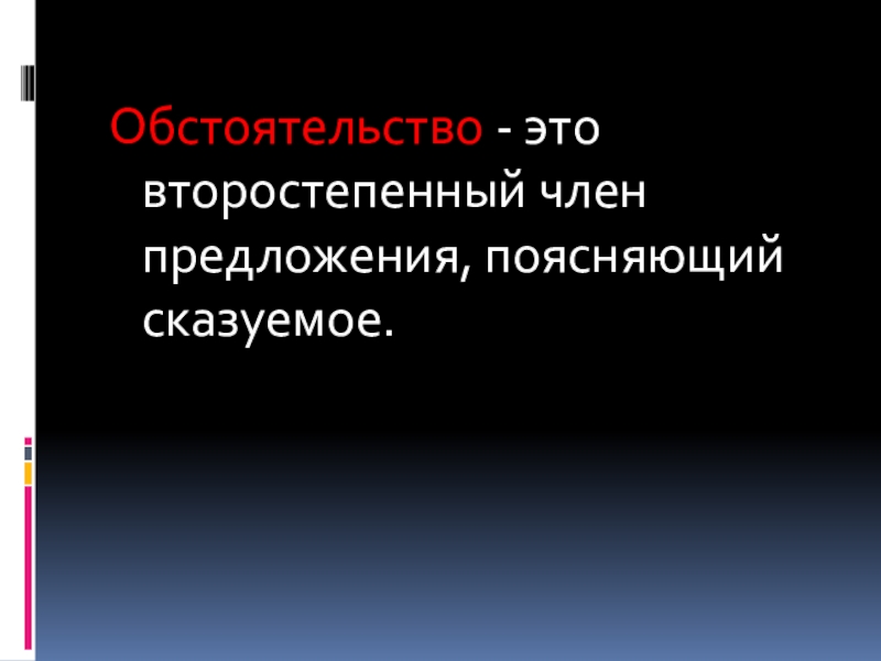 Обстоятельство - это второстепенный член предложения, поясняющий сказуемое.