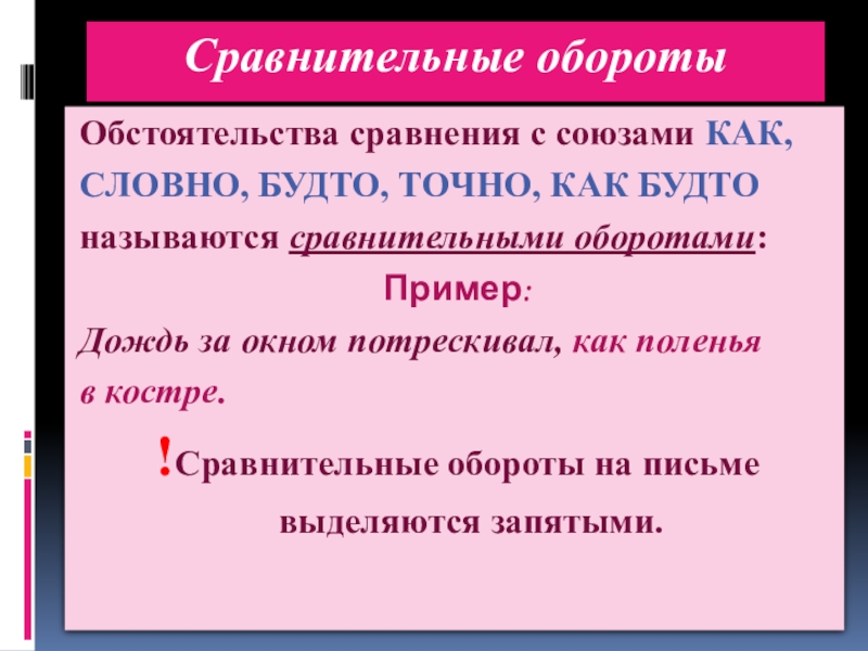 Сравнительные оборотыОбстоятельства сравнения с союзами КАК,СЛОВНО, БУДТО, ТОЧНО, КАК БУДТОназываются сравнительными оборотами:Пример:Дождь за окном потрескивал, как поленьяв
