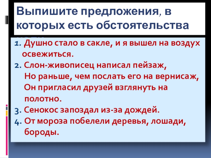 Слайд 9Выпишите предложения, в которых есть обстоятельства цели: