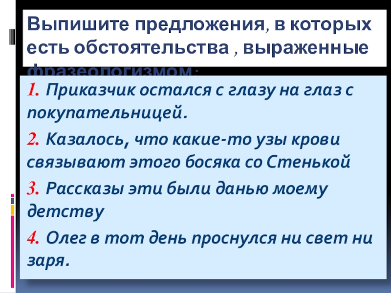 Слайд 10Выпишите предложения, в которых есть обстоятельства , выраженные фразеологизмом: