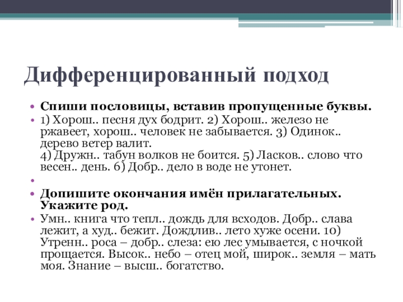 4) Дружн.. табун волков не боится. 5) Ласков.. слово что весен.. день. 6) Добр.. дело в воде не утонет.