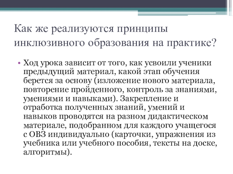 как усвоили ученики предыдущий материал, какой этап обучения берется за основу (изложение нового материала, повторение пройденного, контроль за знаниями, умениями и навыками). Закрепление и отработка полученных знаний, умений и навыков проводятся на разном дидактическом материале, подобранном для каждого учащегося с ОВЗ индивидуально (карточки, упражнения из учебника или учебного пособия, тексты на доске, алгоритмы).