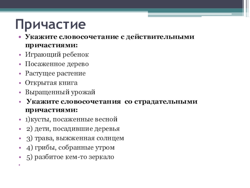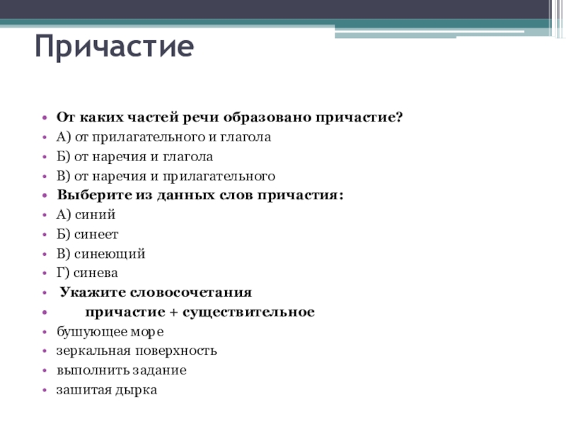 Зеленый, весел, построен, красен, выученные, наполнен, завален, сушеные