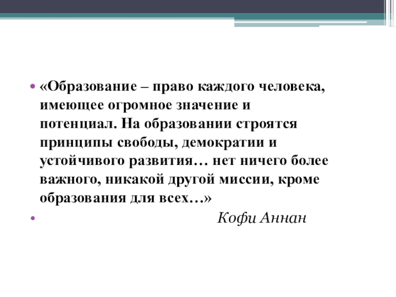 значение и потенциал. На образовании строятся принципы свободы, демократии и устойчивого развития… нет ничего более важного, никакой другой миссии, кроме образования для всех…»