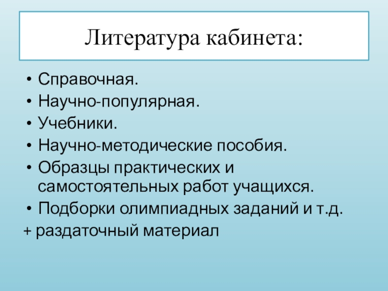 Литература кабинета:Справочная.Научно-популярная.Учебники.Научно-методические пособия.Образцы практических и самостоятельных работ учащихся.Подборки олимпиадных заданий и т.д.+ раздаточный материал