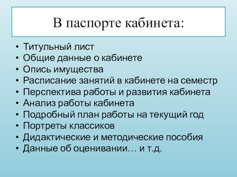 Слайд 5В паспорте кабинета: