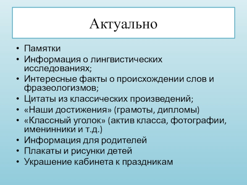 АктуальноПамяткиИнформация о лингвистических исследованиях;Интересные факты о происхождении слов и фразеологизмов;Цитаты из классических произведений;«Наши достижения» (грамоты, дипломы)«Классный уголок»