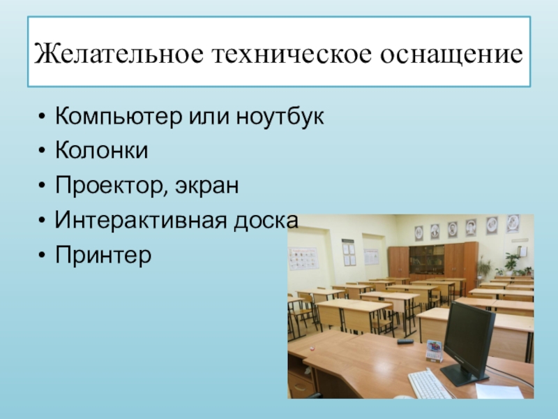 Желательное техническое оснащениеКомпьютер или ноутбукКолонкиПроектор, экранИнтерактивная доскаПринтер