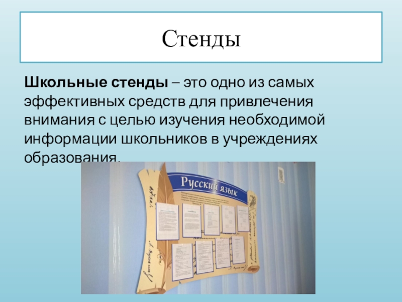 СтендыШкольные стенды – это одно из самых эффективных средств для привлечения внимания с целью изучения необходимой информации школьников