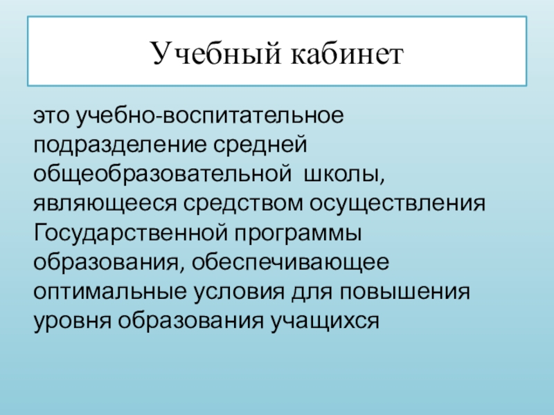 Учебный кабинетэто учебно-воспитательное подразделение средней общеобразовательной  школы, являющееся средством осуществления Государственной программы образования, обеспечивающее оптимальные условия для повышения уровня образования учащихся