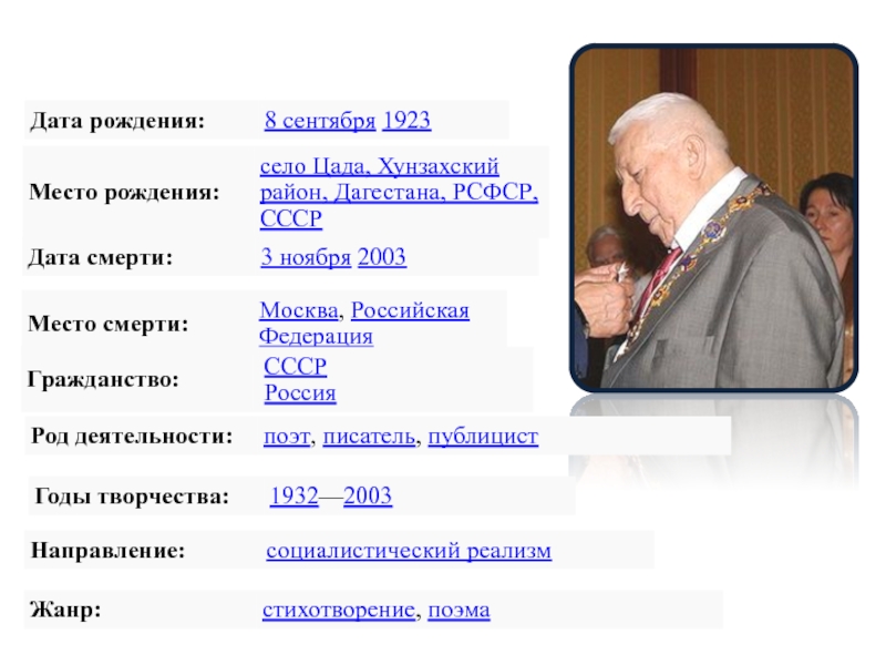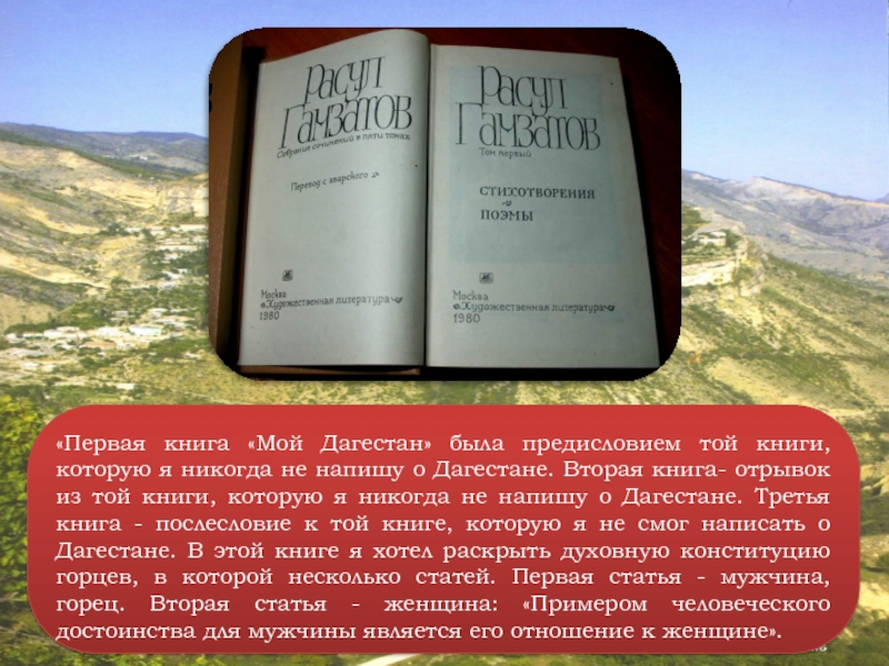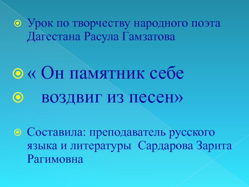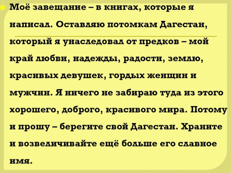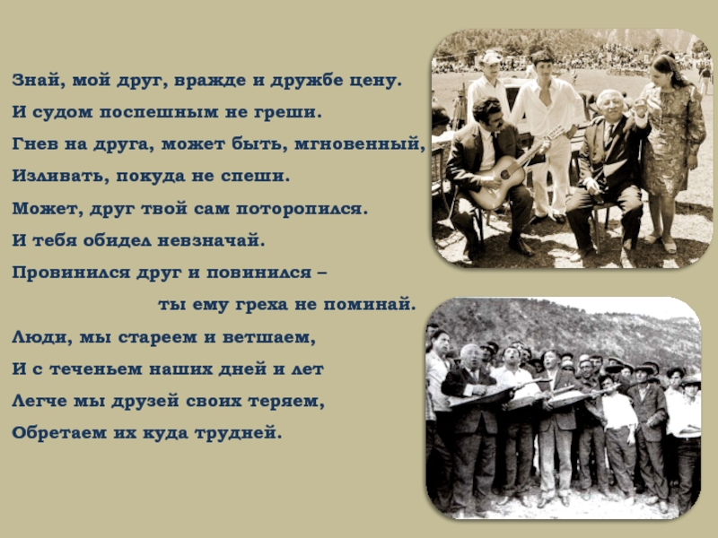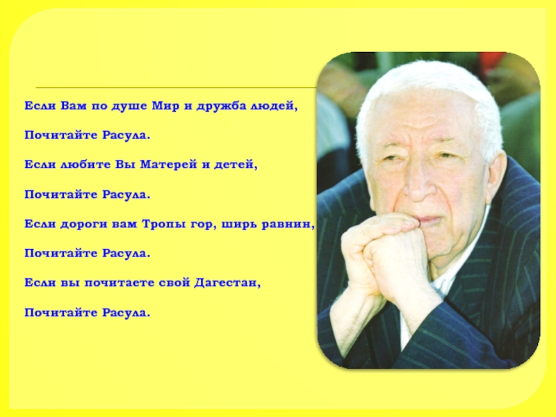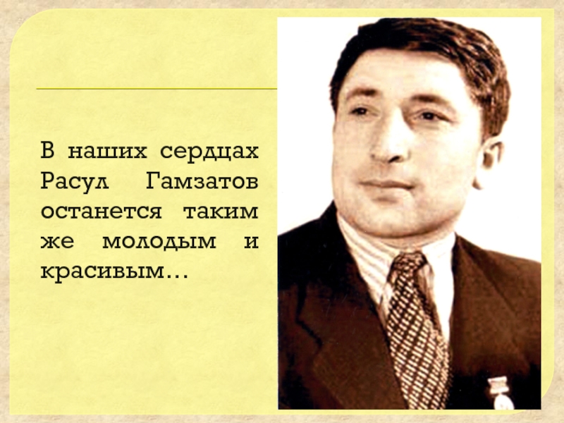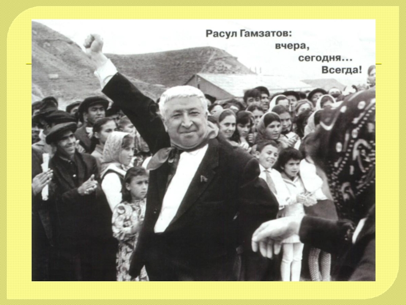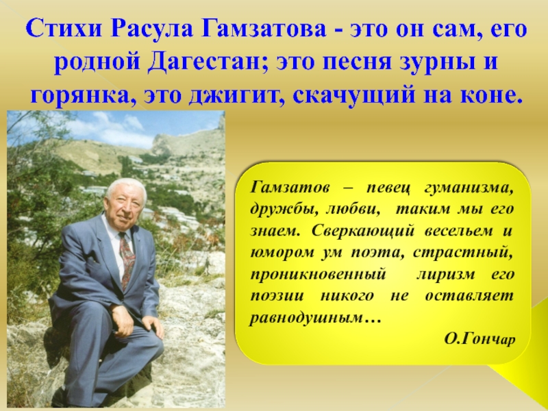 Гамзатов – певец гуманизма, дружбы, любви, таким мы его знаем. Сверкающий весельем и юмором ум поэта, страстный, проникновенный лиризм его поэзии никого не оставляет равнодушным…