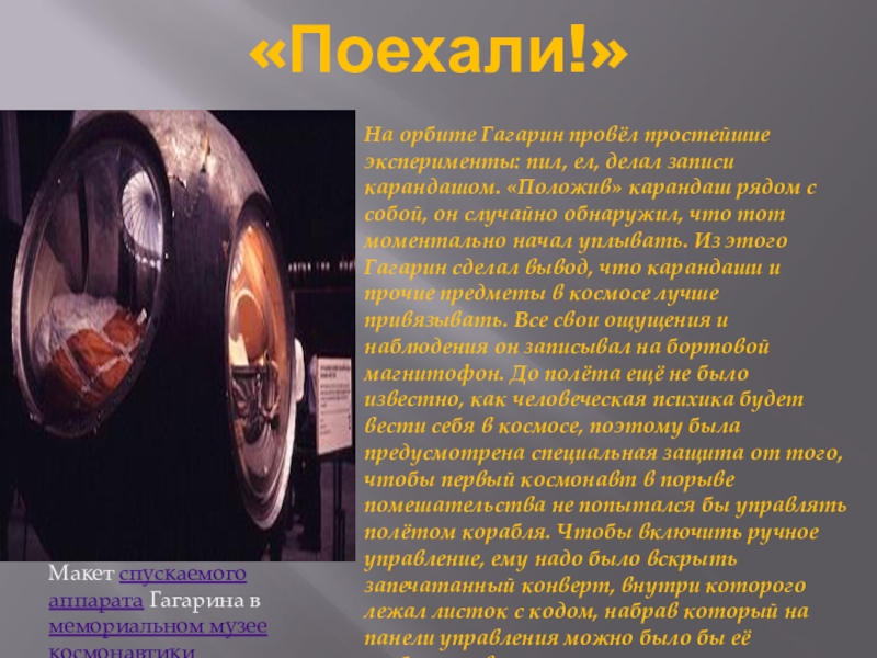 На орбите Гагарин провёл простейшие эксперименты: пил, ел, делал записи карандашом.