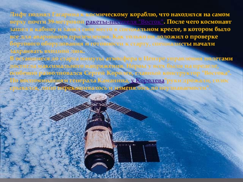 почти 39-метровой ракеты-носителя "Восток". После чего космонавт зашел в кабину и занял свое место в специальном кресле, в котором было все для аварийного приземления. Как только он доложил о проверке бортового оборудования и готовности к старту, специалисты начали задраивать входной люк.