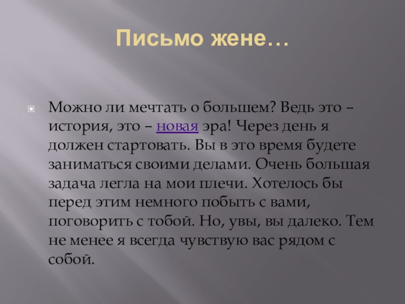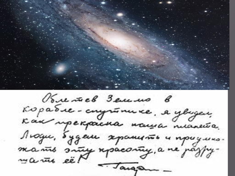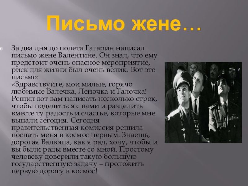 Решил вот вам написать несколько строк, чтобы поделиться с вами и разделить вместе ту радость и счастье, которые мне выпали сегодня. Сегодня правительственная комиссия решила послать меня в космос первым. Знаешь, дорогая Валюша, как я рад, хочу, чтобы и вы были рады вместе со мной. Простому человеку доверили такую большую государственную задачу – проложить первую дорогу в космос!