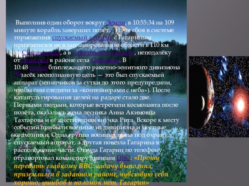 завершил полёт. Из-за сбоя в системе торможения спускаемый аппарат с Гагариным приземлился не в запланированной области в 110 км от Сталинграда, а в Саратовской области, неподалёку от Энгельса в районе села Смеловка. В 10:48 радар близлежащего ракетно-зенитного дивизиона[19]засёк неопознанную цель — это был спускаемый аппарат (зенитчиков за сутки до этого предупредили, чтобы они следили за «контейнерами с неба»). После катапультирования целей на радаре стало две.
