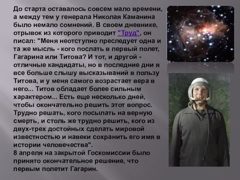 Николая Каманина было немало сомнений. В своем дневнике, отрывок из которого приводит "Труд", он писал: "Меня неотступно преследует одна и та же мысль - кого послать в первый полет, Гагарина или Титова? И тот, и другой - отличные кандидаты, но в последние дни я все больше слышу высказываний в пользу Титова, и у меня самого возрастает вера в него... Титов обладает более сильным характером... Есть еще несколько дней, чтобы окончательно решить этот вопрос. Трудно решать, кого посылать на верную смерть, и столь же трудно решить, кого из двух-трех достойных сделать мировой известностью и навеки сохранить его имя в истории человечества".