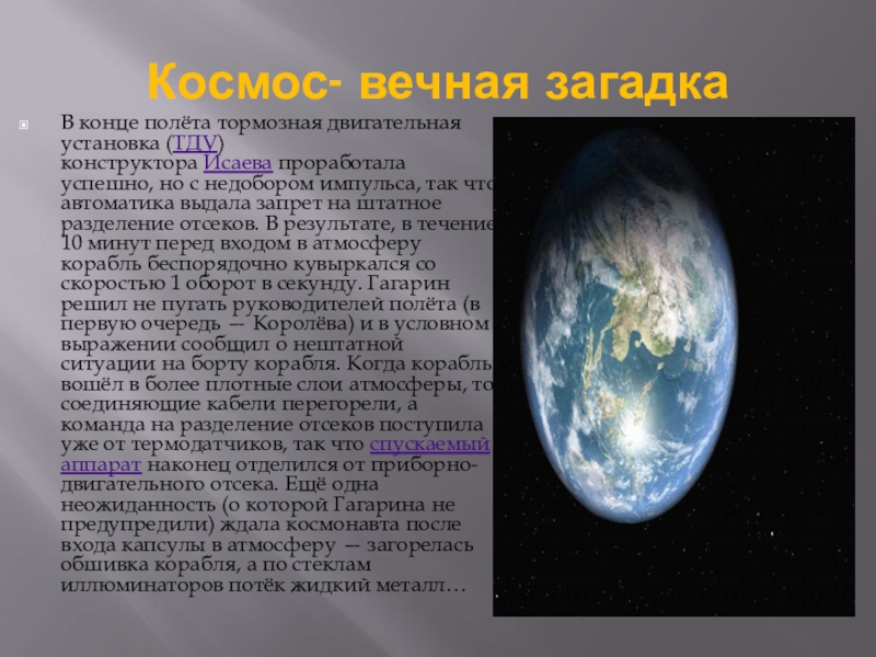 но с недобором импульса, так что автоматика выдала запрет на штатное разделение отсеков. В результате, в течение 10 минут перед входом в атмосферу корабль беспорядочно кувыркался со скоростью 1 оборот в секунду. Гагарин решил не пугать руководителей полёта (в первую очередь — Королёва) и в условном выражении сообщил о нештатной ситуации на борту корабля. Когда корабль вошёл в более плотные слои атмосферы, то соединяющие кабели перегорели, а команда на разделение отсеков поступила уже от термодатчиков, так что спускаемый аппарат наконец отделился от приборно-двигательного отсека. Ещё одна неожиданность (о которой Гагарина не предупредили) ждала космонавта после входа капсулы в атмосферу — загорелась обшивка корабля, а по стеклам иллюминаторов потёк жидкий металл…