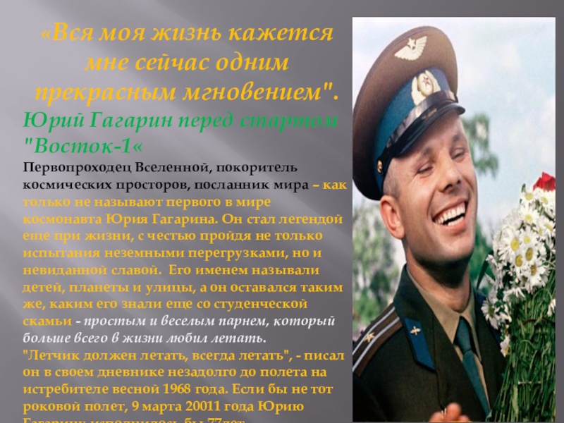 "Летчик должен летать, всегда летать", - писал он в своем дневнике незадолго до полета на истребителе весной 1968 года. Если бы не тот роковой полет, 9 марта 20011 года Юрию Гагарину исполнилось бы 77лет.